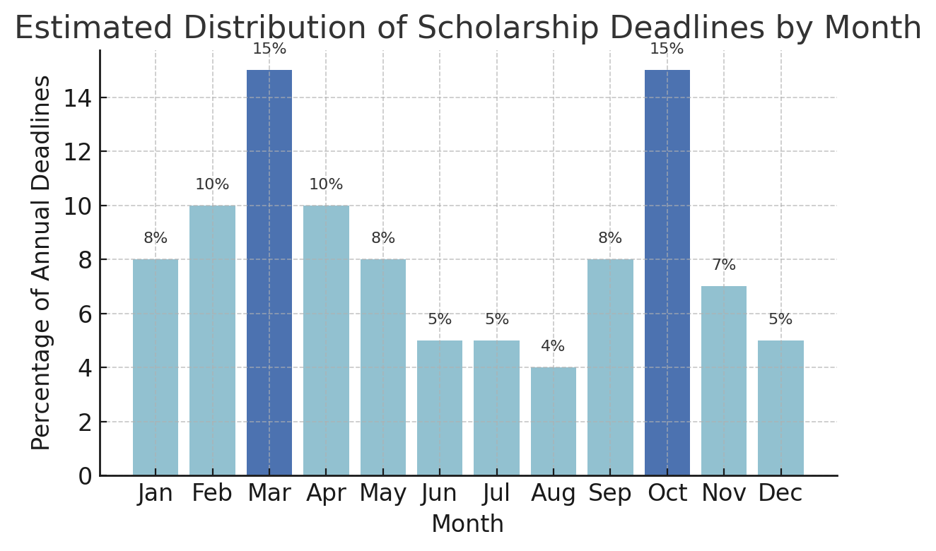 Make a Scholarship Calendar: As soon as you start finding scholarships, note their deadlines on a calendar or planner (digital or paper). Many scholarship deadlines cluster in the fall and early spring. In fact, the bulk of deadlines run from September through May, with a big wave typically in October (fall term) and another in March (spring term) as shown above. 📊 Mark these high-volume months so you can prepare in advance. Also note any outlier deadlines (there are some summer deadlines, e.g. July/August awards for fall term – don’t miss those either).