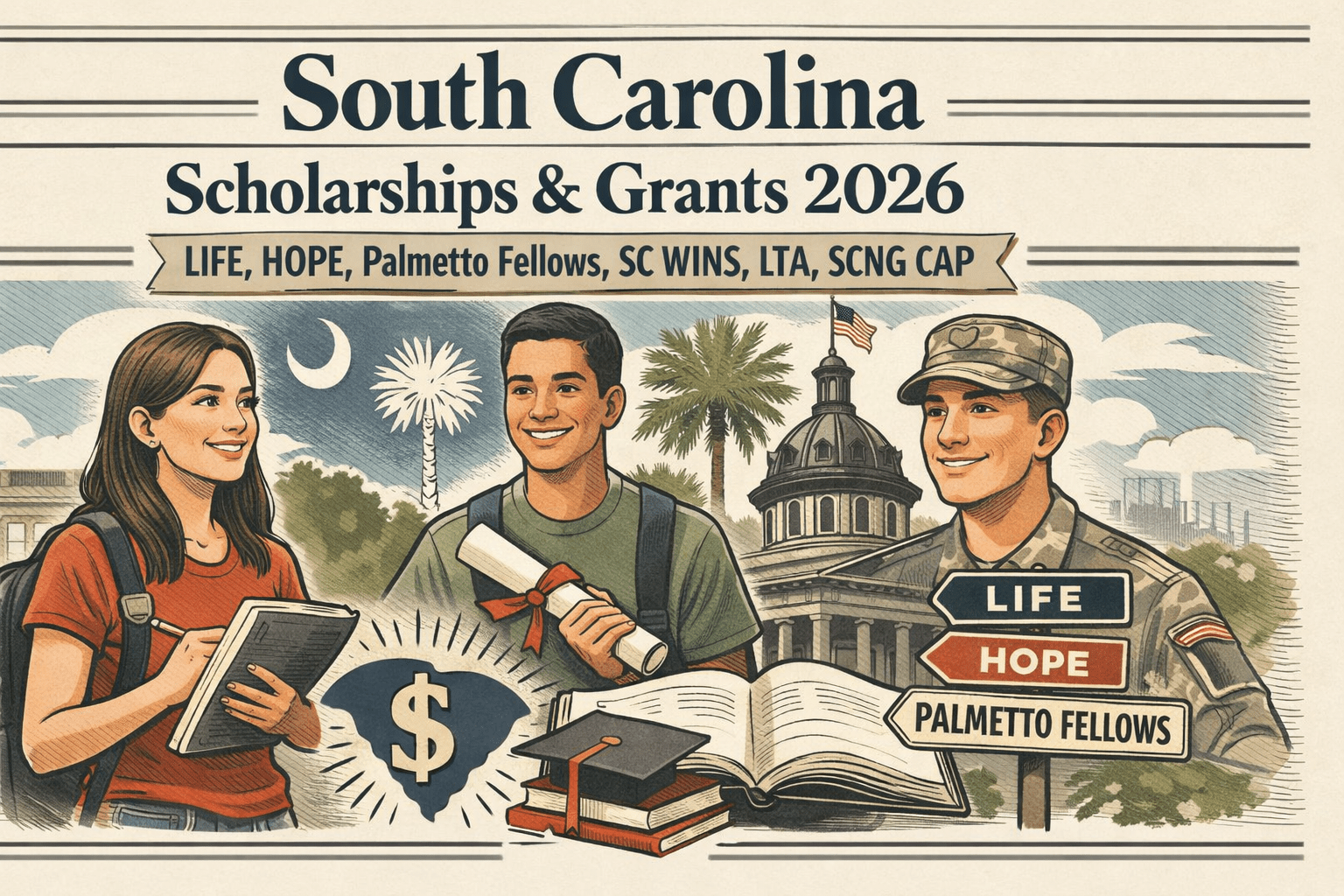 South Carolina: South Carolina invests heavily in merit scholarships for its students. The main ones are the LIFE Scholarship and Palmetto Fellows Scholarship. The LIFE Scholarship is awarded automatically to students who meet two of three criteria (3.0 GPA, 1100 SAT/24 ACT, top 30% class rank) – it provides up to ~$5,000 per year toward tuition at in-state publics (or a smaller amount at privates). High-achieving students can earn the Palmetto Fellows award instead (with higher GPA/test requirements), which offers up to ~$6,700 for freshmen and ~$7,500 for upperclassmen per year. Additionally, South Carolina has a one-year HOPE Scholarship (not to be confused with Georgia’s HOPE) for students who just miss LIFE criteria – it gives around $2,800 for the freshman year. Together, these lottery-funded scholarships make college more affordable for thousands of South Carolinians.