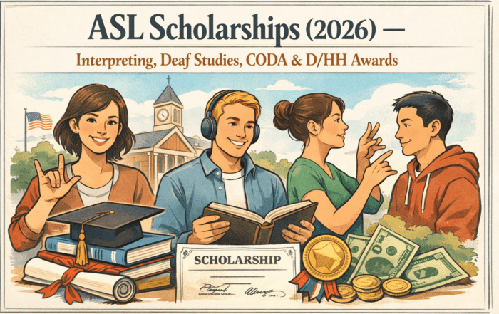 ASL Scholarships (2026) — Interpreting, Deaf Studies, CODA & D/HH Awards Verified list of 20+ ASL & Deaf-community scholarships for 2026: interpreting (RID, WSRID), ASL Honor Society, CODA, NBDA, TAPED, Gallaudet, NTID & more. Deadlines [...]